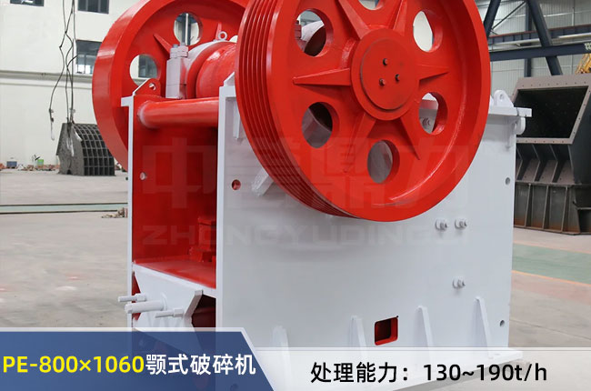 PE-800×1060顎式破碎機(jī)以進(jìn)料口800×1060mm命名,較大進(jìn)料粒度≤640mm,時(shí)處理能力在130-190噸,出料可調(diào)范圍在130-190mm,配備的8級(jí)110kw的電機(jī),設(shè)備總重量是29.8噸。