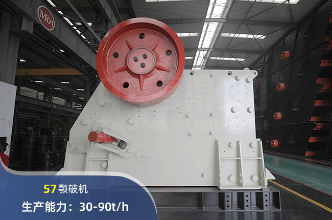 57顎式破碎機偏心軸轉(zhuǎn)速為250r/min,搭配55kw電機,電動機型號為Y315-8,轉(zhuǎn)速是720r/min,該設(shè)備不含電機重10.5噸。