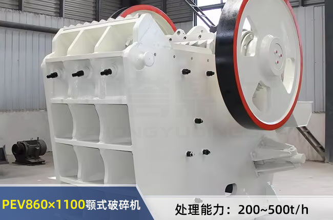 PEV860×1100顎式破碎機(jī)進(jìn)料大小≤730mm,出料100-200mm之間,時(shí)產(chǎn)量在200-500噸,配置功率110-132千瓦電機(jī),設(shè)備外形尺寸為4870×2850×3170mm,重量為32噸。